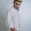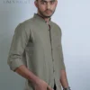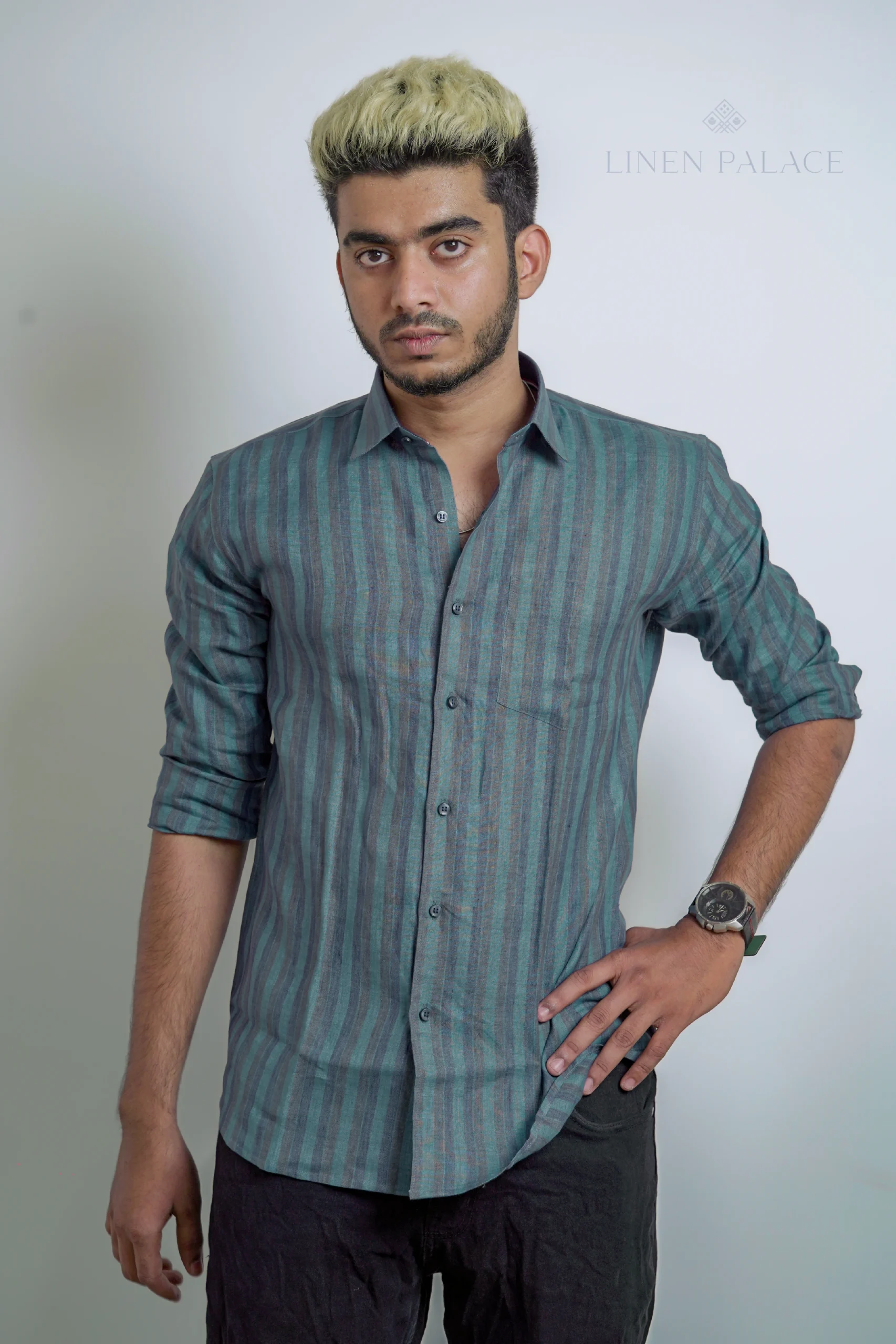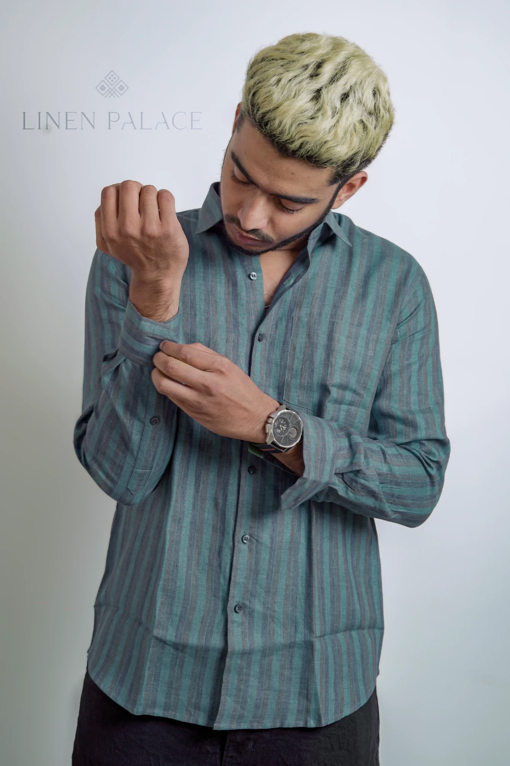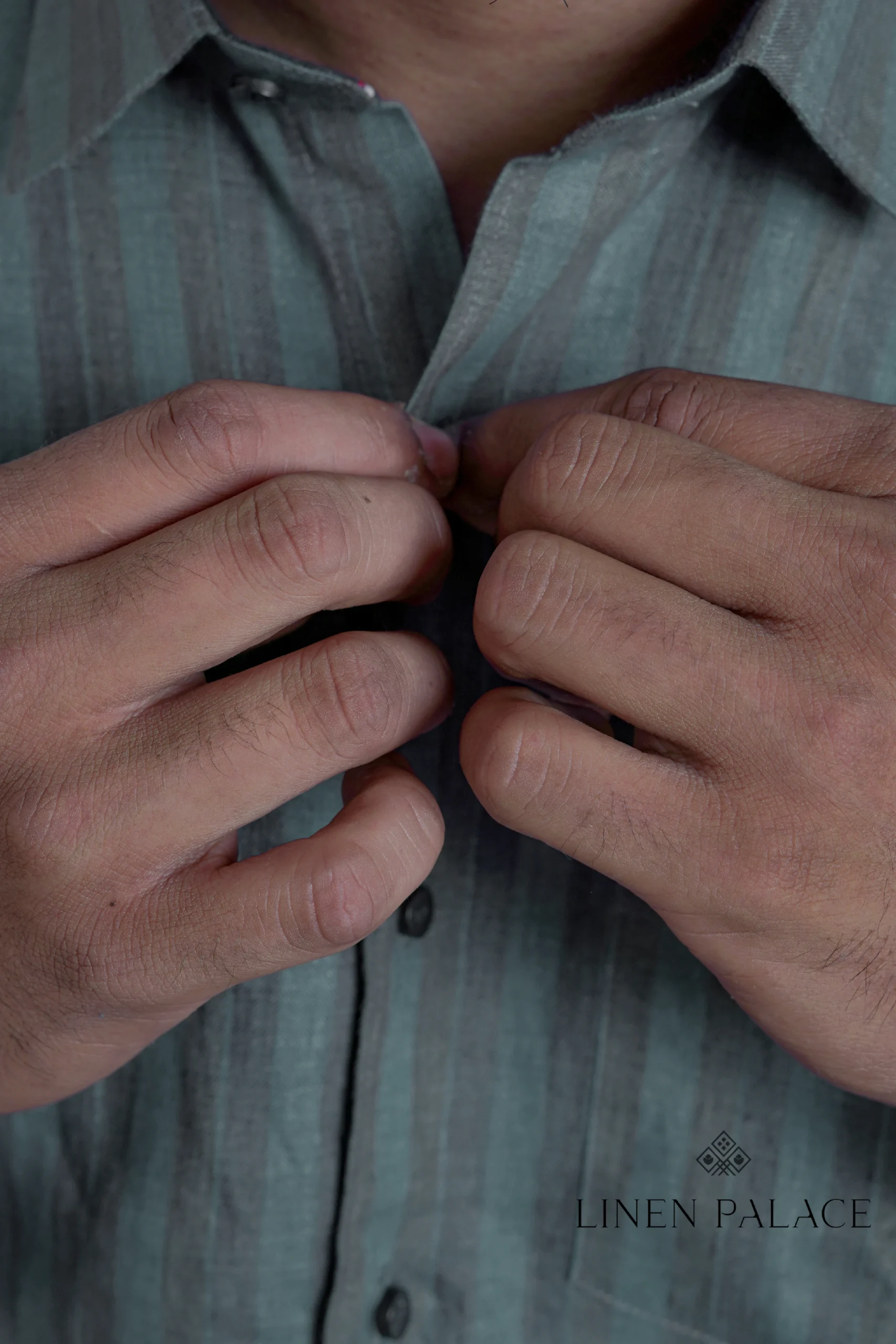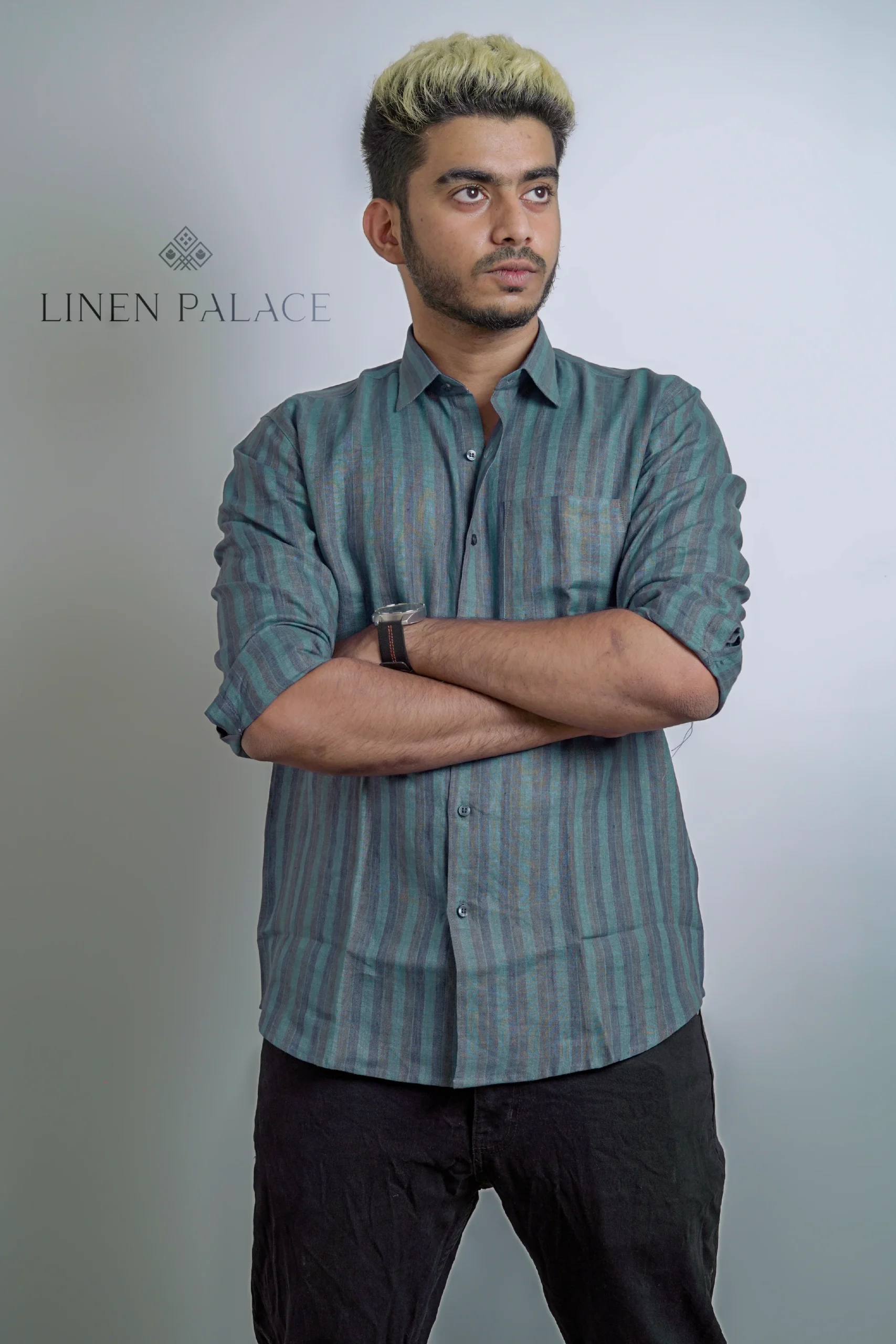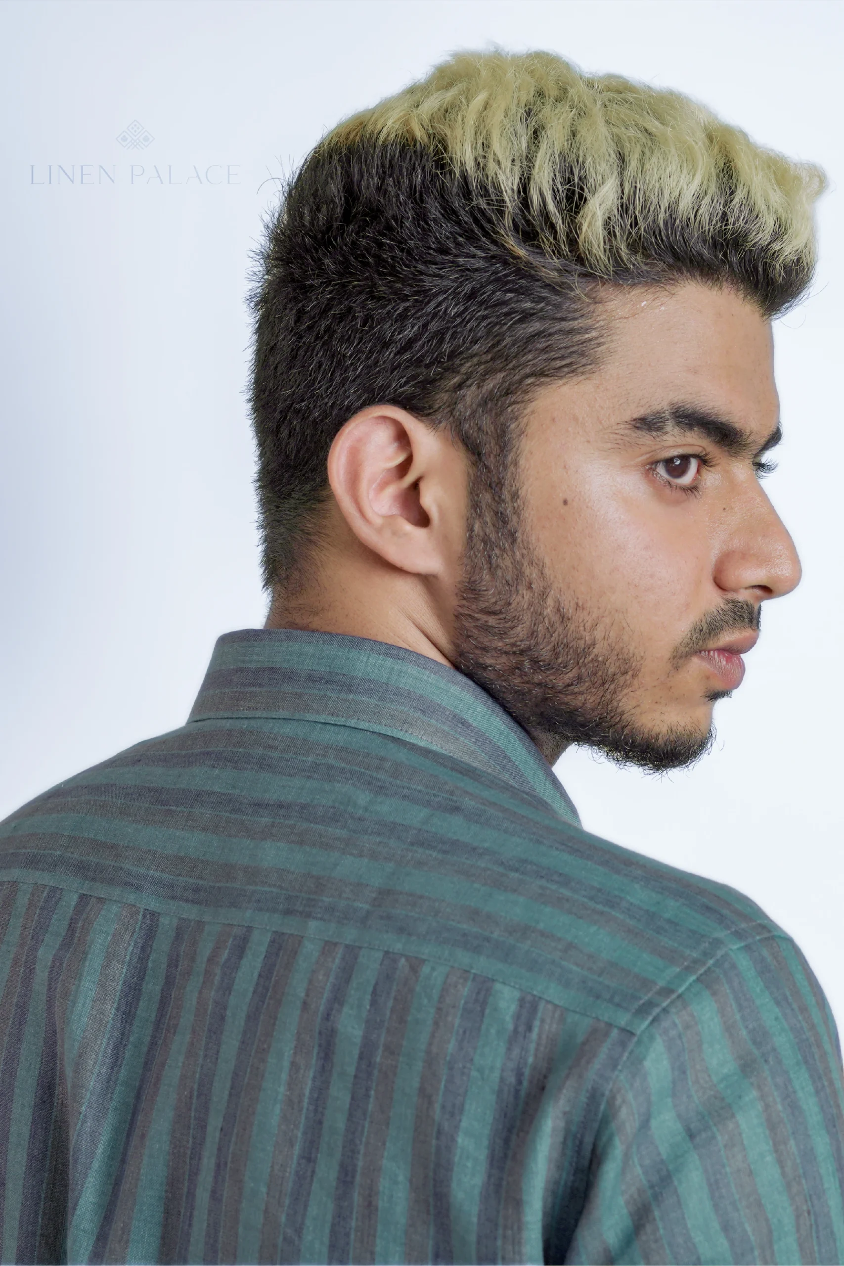 The pure linen green striped shirt is a stylish and refreshing garment crafted from high-quality linen fabric. It showcases a vibrant green color with subtle stripes running vertically across the fabric, adding a touch of visual interest to the design.