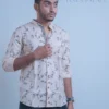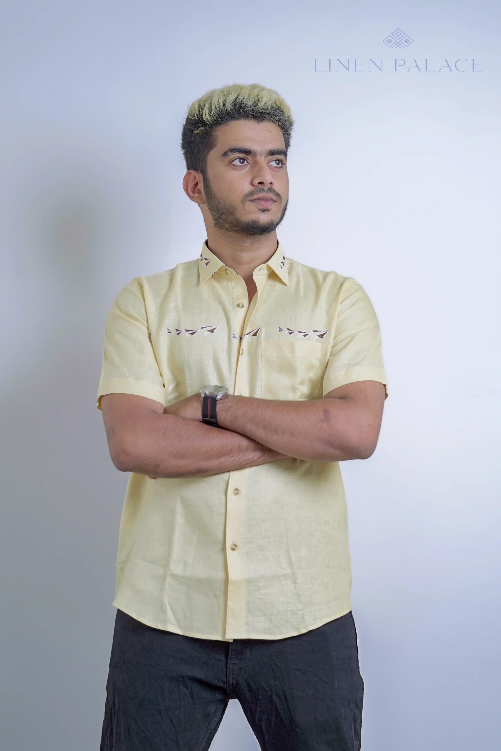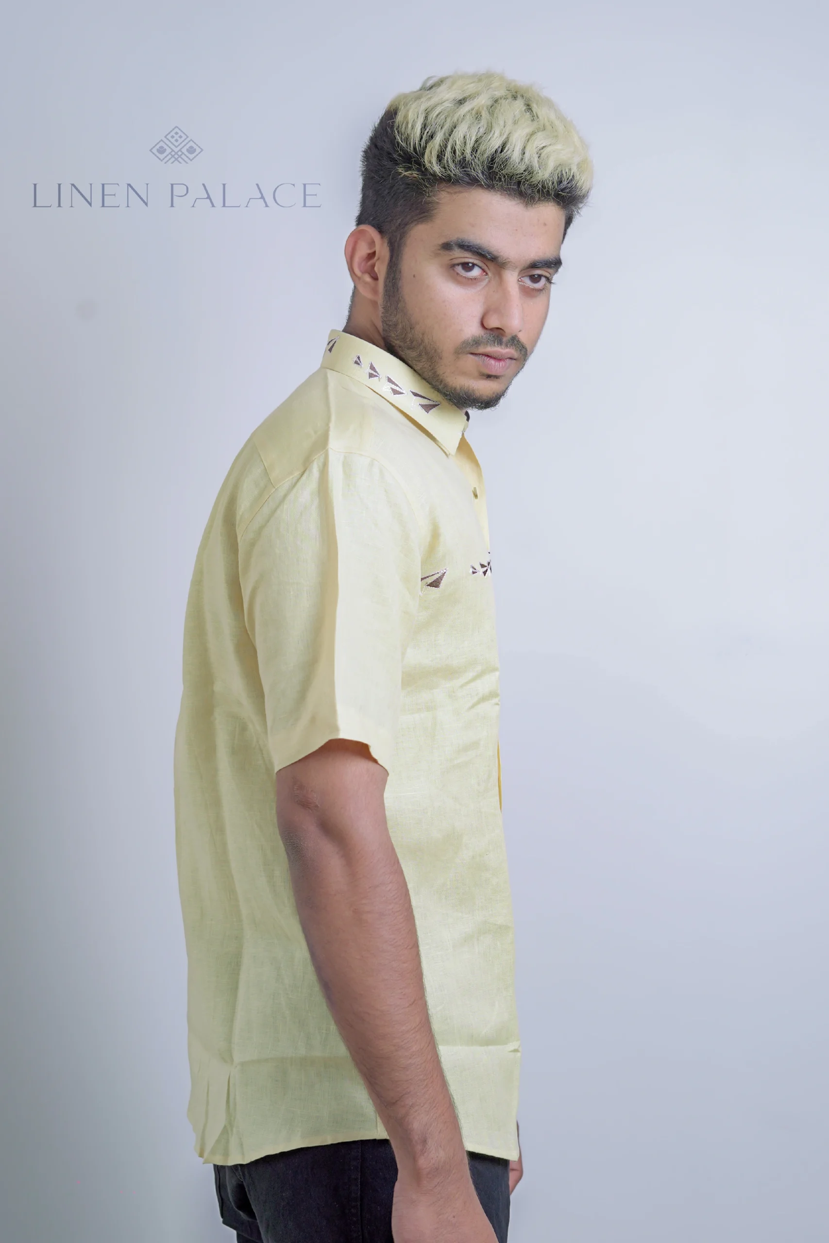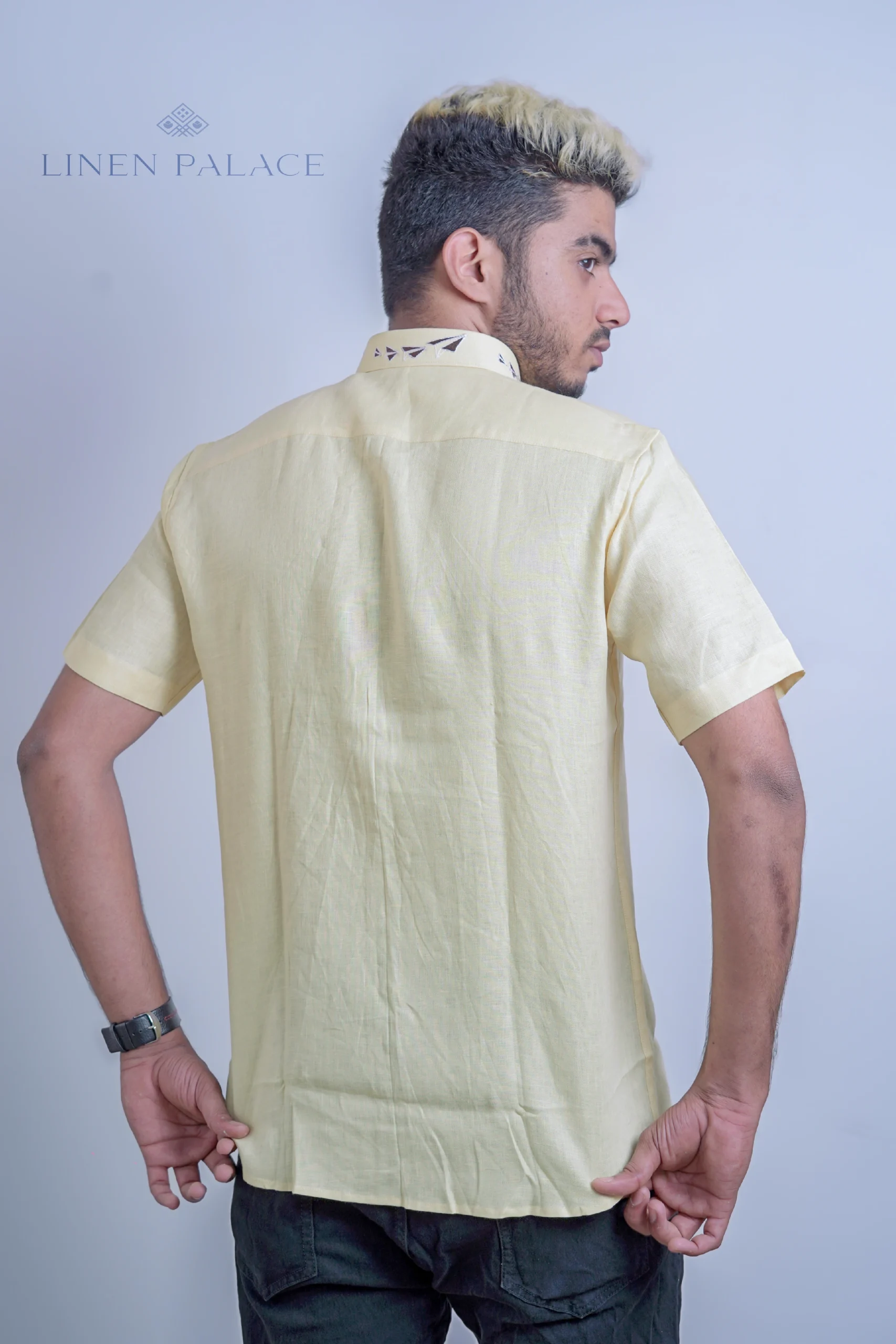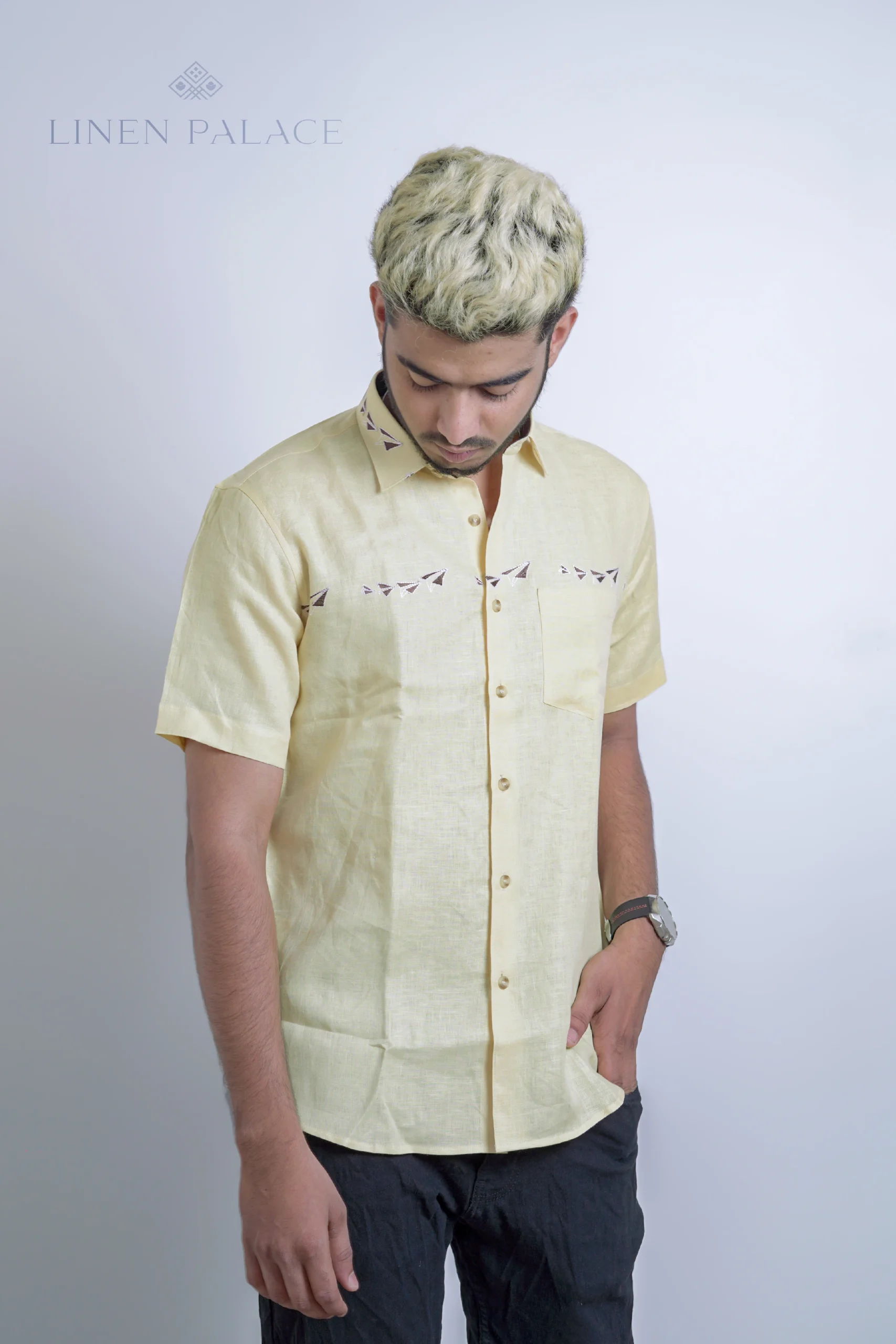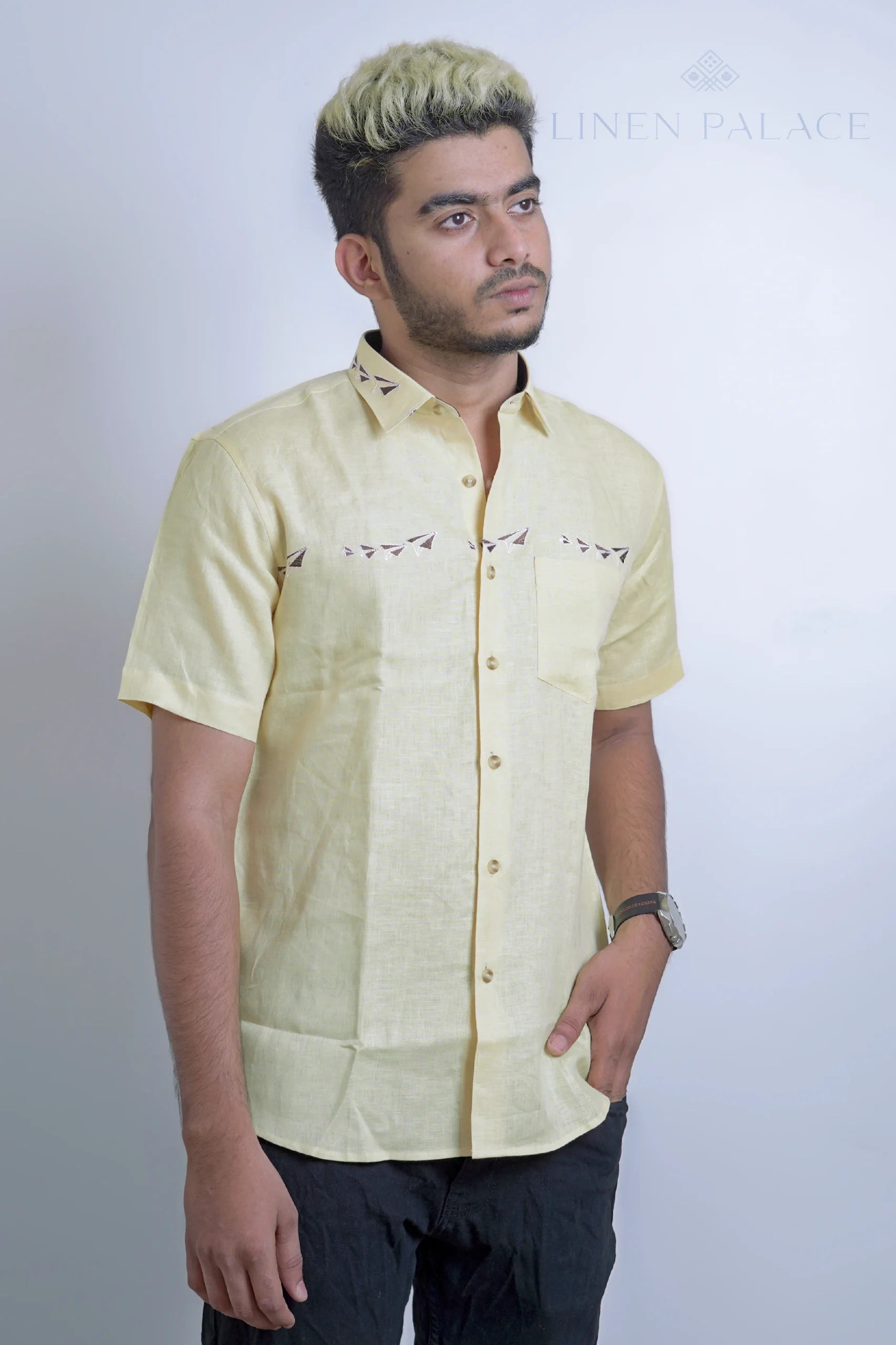 The pure linen yellow kite print shirt is a statement piece that can be paired with jeans or shorts for a fun and playful casual look. It adds a burst of color and personality to your outfit, making it suitable for various casual occasions and outings.