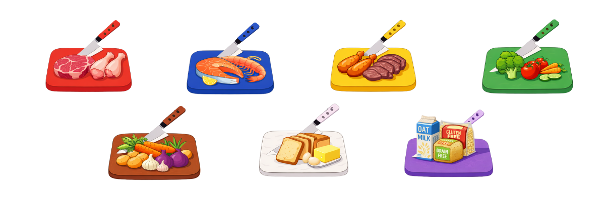 In professional kitchens, colour-coded chopping boards are widely used to reduce the risk of cross-contamination. Each colour is assigned to a specific type of food, such as red for raw meat, blue for raw fish, and green for salad and fruit. By using separate boards for different ingredients, kitchens can prevent harmful bacteria from spreading between food types.